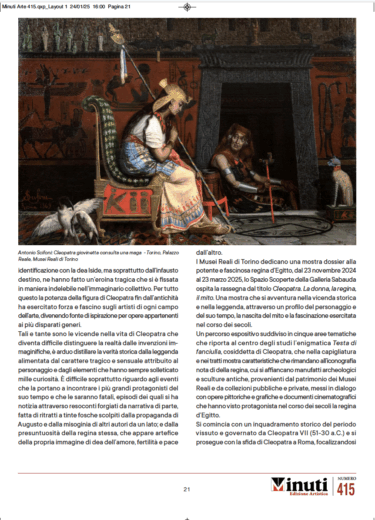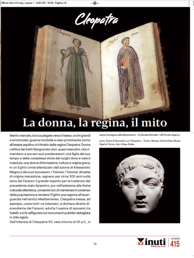 Tra le pagine del numero 415 di Minuti Edizione Arte, la rivista curata da Fondazione Menarini, prende forma il ritratto di una delle figure più affascinanti e complesse dell’antichità: Cleopatra VII. Ultima regina dell’Egitto tolemaico, protagonista di alleanze strategiche, intrighi di potere e leggende immortali, Cleopatra è molto più di un nome scolpito nei manuali di storia: è un simbolo, una presenza che attraversa i secoli con il peso del mito e la forza della realtà.