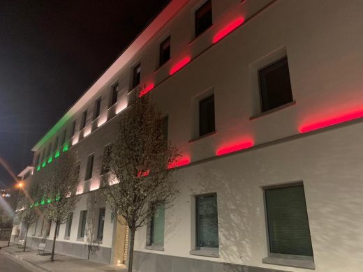 Menarini, la sede di Firenze illuminata con i colori della bandiera italiana, in segno di solidarietà.