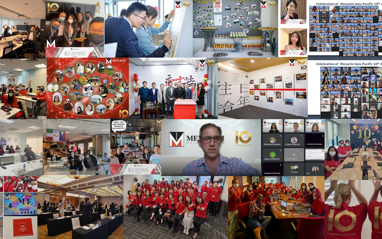 L’11 novembre 2021 si sono tenuti festeggiamenti in tutti gli uffici di Menarini Asia-Pacific. Inoltre, i dipendenti di Menarini AP si sono collegati da varie sedi asiatiche per partecipare alla Riunione Aziendale dello Staff per il Decimo Anniversario, durante la quale hanno potuto approfondire la storia di Menarini Asia-Pacific, festeggiare i successi di questo primo decennio di attività e segnare l’inizio di un nuovo futuro insieme.