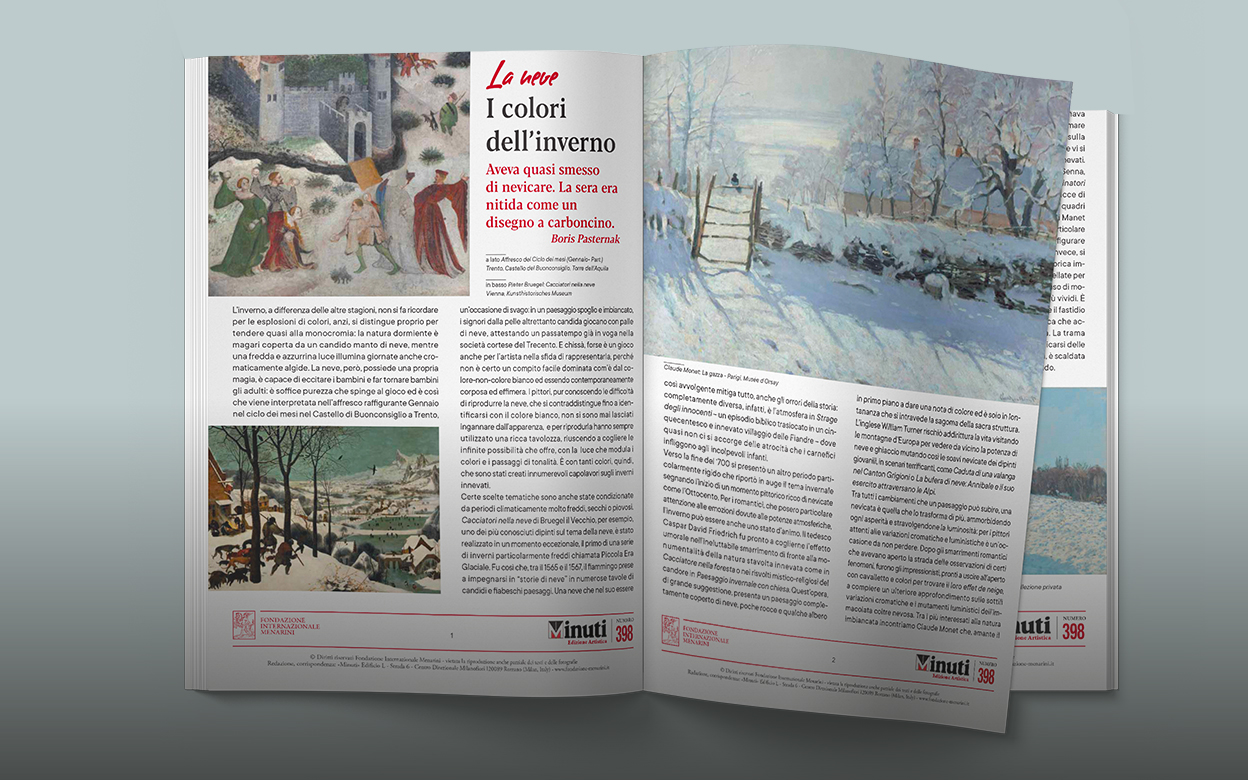 Tra le edizioni più recenti e suggestive, il numero 398, con l’articolo “La neve e i colori dell’inverno”, offre una panoramica sull’inverno come tema artistico. La neve, con la sua apparente semplicità, ha ispirato generazioni di artisti che ne hanno esplorato le sfumature, la luce e il significato simbolico. L’articolo accompagna il lettore alla scoperta di opere che spaziano dal Rinascimento al Romanticismo, fino agli Impressionisti e oltre.