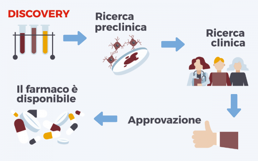 Si inizia, come sempre, dal paziente. Si comincia studiando le cause della malattia per individuare un potenziale bersaglio farmacologico, ossia un meccanismo biologico su cui sia possibile intervenire per ottenere benefici per il paziente. Tale bersaglio è tanto più difficile da individuare quanto più complessa è la malattia studiata e può essere rappresentato da una mutazione del DNA, una proteina difettosa, un microrganismo ecc. Il lavoro dei ricercatori, però, non si ferma qui. Infatti, una volta trovato il bersaglio, il passo successivo è quello di identificare nuove molecole in grado di agire su di esso ed esercitare l’effetto terapeutico auspicato. In questo processo vengono valutate migliaia di molecole, ma solo quella ritenuta potenzialmente idonea dal team di ricercatori proseguirà nello sviluppo e verrà testata in una serie di studi specifici per vagliarne la sicurezza e l’efficacia terapeutica.